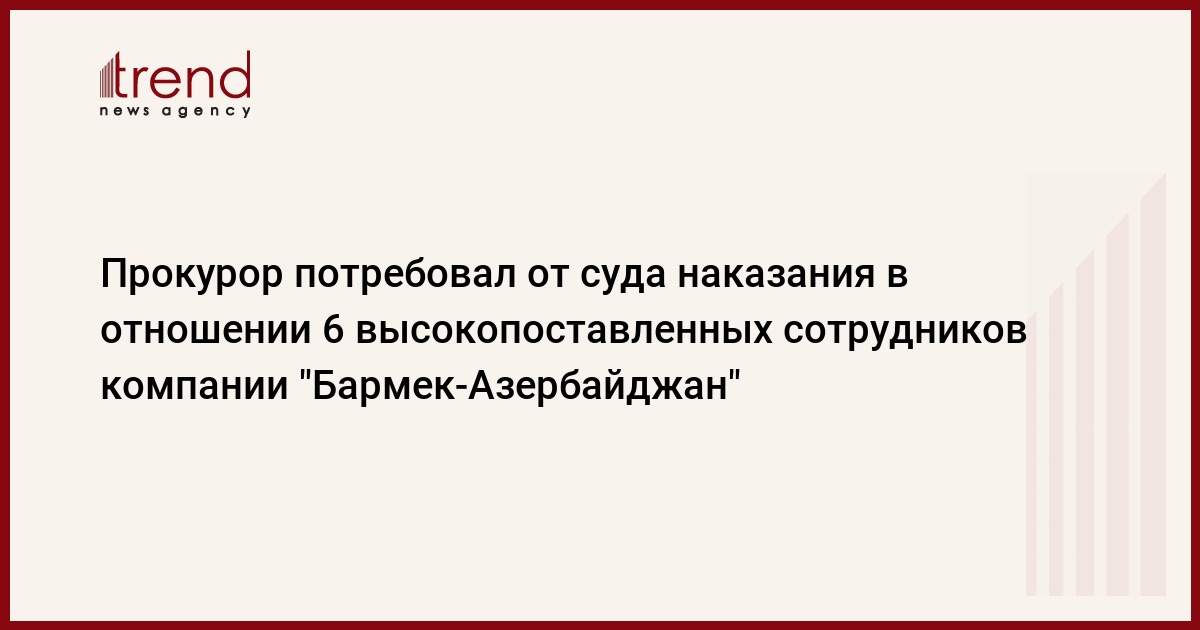 23 ноября в Азербайджанском суде по делам о тяжких преступлениях государственный обвинитель Чингиз Шукюров потребовал от суда наказания в отношении 6 высокопоставленных сотрудников компании "Бармек-Азербайджан". Как передает Trend , судебное заседание проводится под председательством судьи Азера Оруджева.