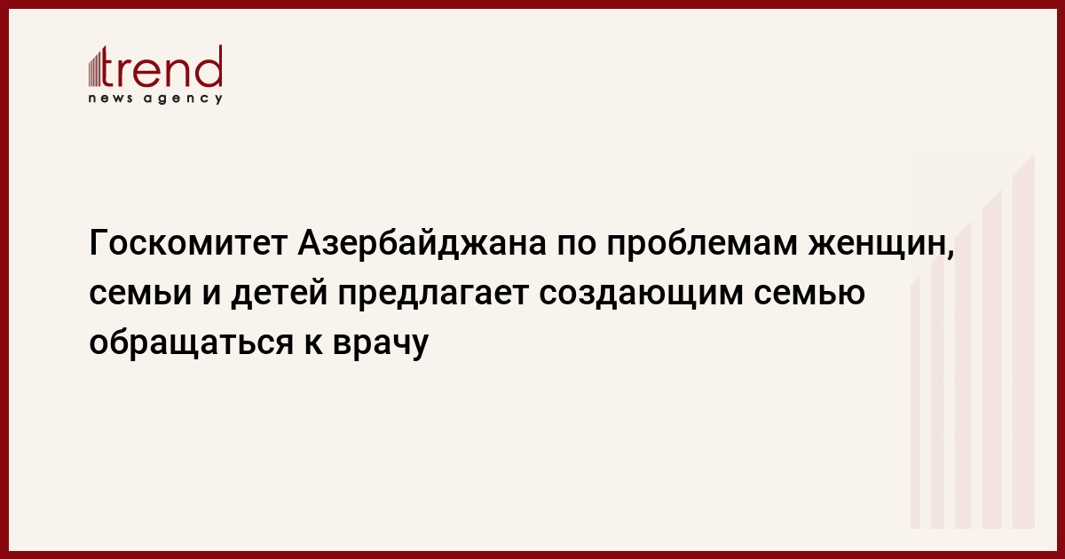 Государственный комитет по проблемам женщин, семьи и детей готовит предложение в Милли Меджлис по внесению изменений и дополнений в Семейный кодекс. Как сообщила Trend заместитель заведующего отделом детских проблем Госкомитета Джейран Рахматуллаева, они считают, что для сохранения здоровья населения все граждане АР, подавая заявления в ЗАГС с желанием вступить в брак, должны представить медицинскую справку о генетическом и кожно-венерологическом здоровье. По мнению Рахматуллаевой, в первую очередь генный анализ необходим вступающим в брак лицам, находящимся в кровно-родственных связях.