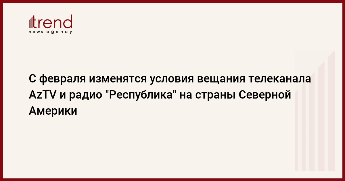 Начиная с первого февраля 2007 года изменятся условия вещания первого телеканала AzTV, а также программы "Республика" азербайджанского радио на Северную Америку. Как передает Trend , этот шаг руководство Закрытого Акционерного Общества Азербайджанского теле- и радиопередач решило предпринять после того, как на телеканал начали поступать многочисленные письма зрителей о плохом вещании на страны Северной Америки.