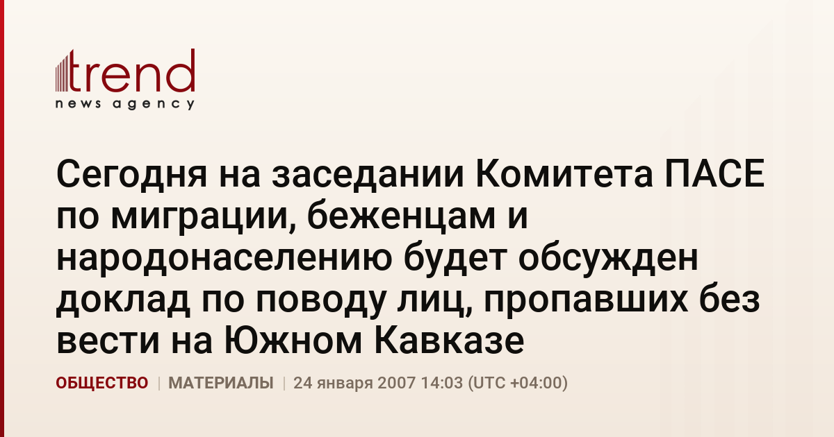 Как передает Trend , на заседании будет обсужден доклад по поводу лиц, пропавших без вести, взятых в плен и заложники на Южном Кавказе. Доклад подготовил голландский депутат Лео Платвоет.