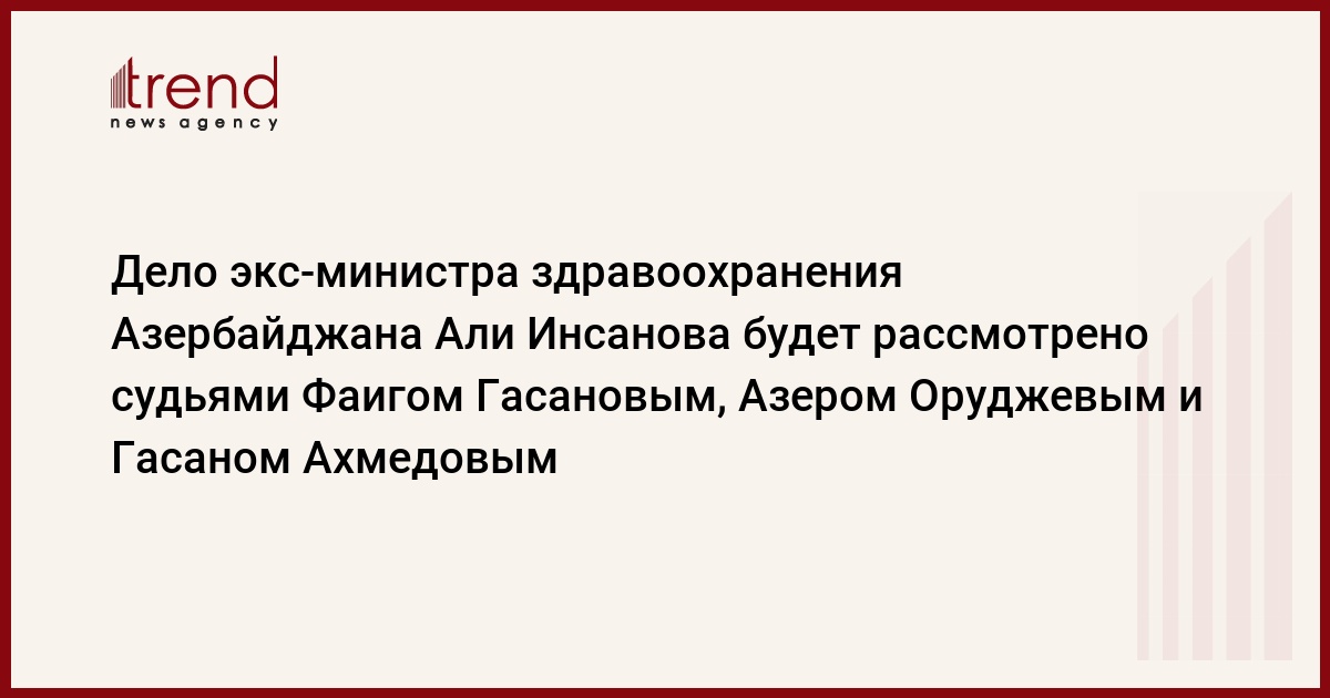 15 февраля предварительное заседание по делу экс-министра здравоохранения Али Инсанова, бывших сотрудником этого министерства начальника отдела медицинской техники Акифа Магеррамова и начальника международных связей Александра Умняшкина пройдет под председательством судьи Фаига Гасымова и судейской коллегии- Азера Оруджева и Гасана Ахмедова. Об этом Trend сообщили в Суде по делам о тяжких преступлениях.