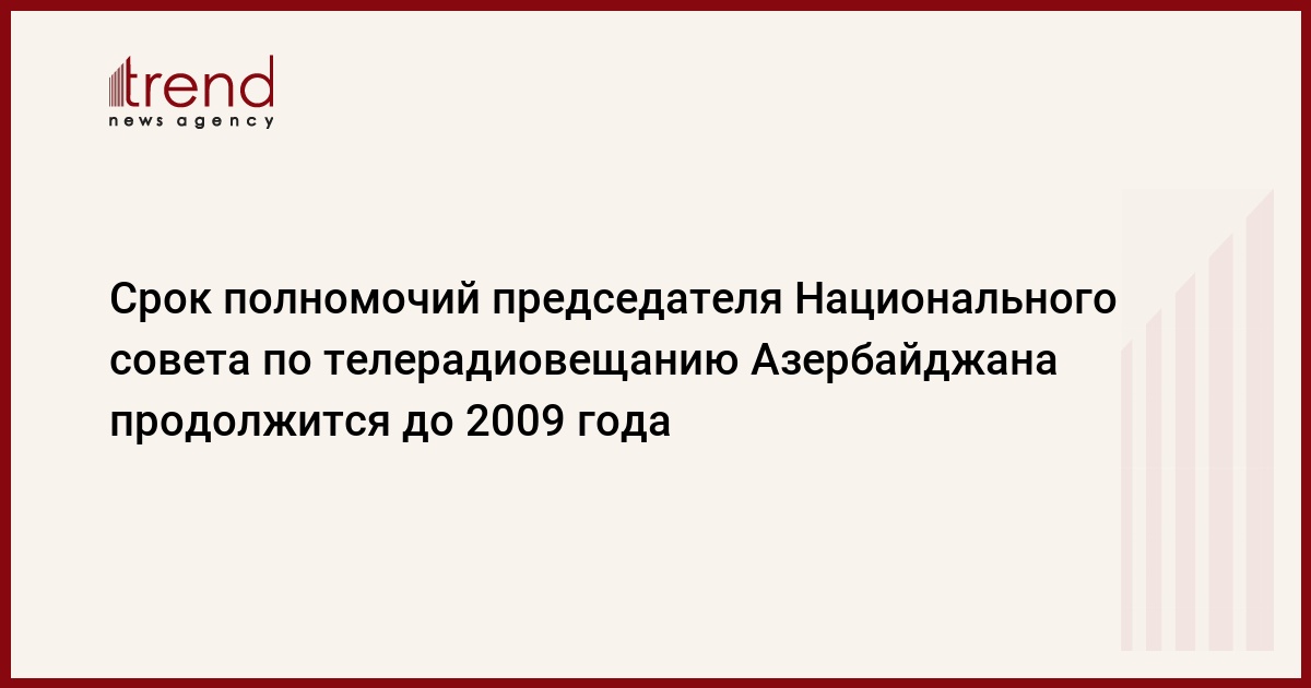 Срок полномочий председателя Национального совета по телерадиовещанию продолжится до 2009 года. Об этом Trend сообщили в Совете по телерадиовещанию.