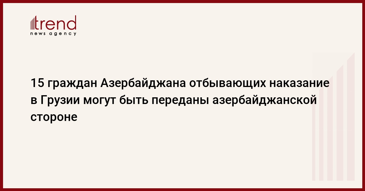 Азербайджан, Баку /корр. Trend С.Агаева/ 15 граждан Азербайджана, отбывающие наказание в Грузии в ближайшее время могут быть переданы азербайджанской стороне, для продолжения отбывания сроков на Родине, сообщили в среду в аппарате уполномоченного по правам человека (омбудсмена) в Азербайджане. Переговоры по их экстрадиции ведутся между министерствами юстиции двух стран, согласно обращениям омбудсмена Азербайджана и народного защитника Грузии. Как сообщили в аппарате омбудсмена, между институтами по правам человека двух стран действует соглашение о сотрудничестве в сфере защиты прав человека, в рамках которой регулярно проводятся мониторинги в местах заключения, где отбывают наказание граждане Азербайджана и Грузии, изучается ситуации по защите их прав.