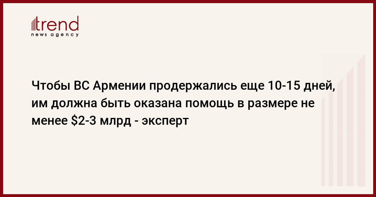 "Не думаю, что кто-то окажет Армении помощь, когда она находится в такой удручающей ситуации как с точки зрения экономики, так и военного дела. Да, есть определенные исключения, к примеру в настоящее время тайными путями Армении передается вооружение на безвозмездной основе. Но давайте проанализируем, поможет ли это. Для восполнения потерь армии Армении, чтобы ВС этой страны продержались еще 10-15 дней, им должна быть оказана помощь в размере не менее 2-3 миллиардов долларов. Однако в условиях нынешнего превосходства армии Азербайджана этого никто не сделает. Безусловно каждый понимает, что это не даст пользу. Следовательно, из этого следует констатировать, что Армения потеряла большую часть военного потенциала, на дополнительную закупку средств не хватает, и в нынешних условиях никто не окажет этой стране военную помощь в размере 2-3 миллиардов долларов", - добавил Эльданиз Амиров.