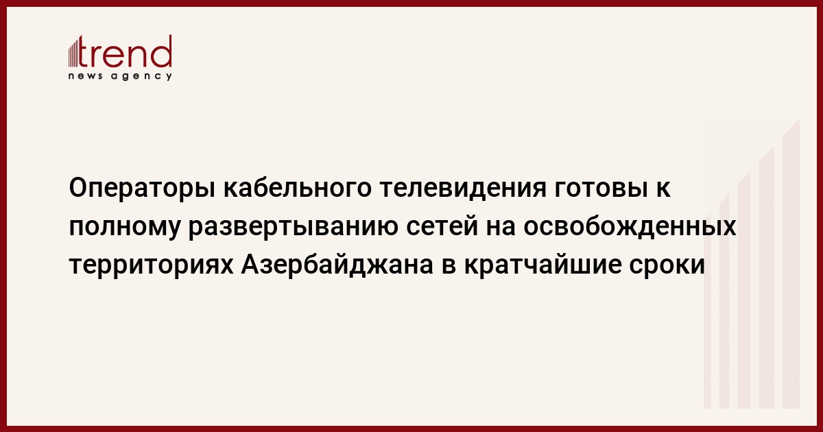 "Члены ассоциации – операторы кабельного телевидения готовы к полному развертыванию сетей на освобожденных территориях в кратчайшие сроки. Но необходимо отметить, что почти 30-летняя оккупация привела к полному разрушению всей инфраструктуры этих регионов и сначала нужно создавать условия для нормального проживания людей там, строить дороги, дома, общественно значимые объекты, а также обеспечить коммуникациями и коммунальными услугами", - сказал Алиев.