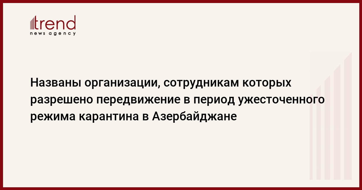 БАКУ /Trend/ - Кабинет министров Азербайджана опубликовал список государственных органов, принадлежащих государству юридических лиц, в том числе созданных от имени государства публичных юридических лиц, сотрудникам которых разрешается передвижение после внесения работодателем данных о них в портал icaze.e-gov.az.