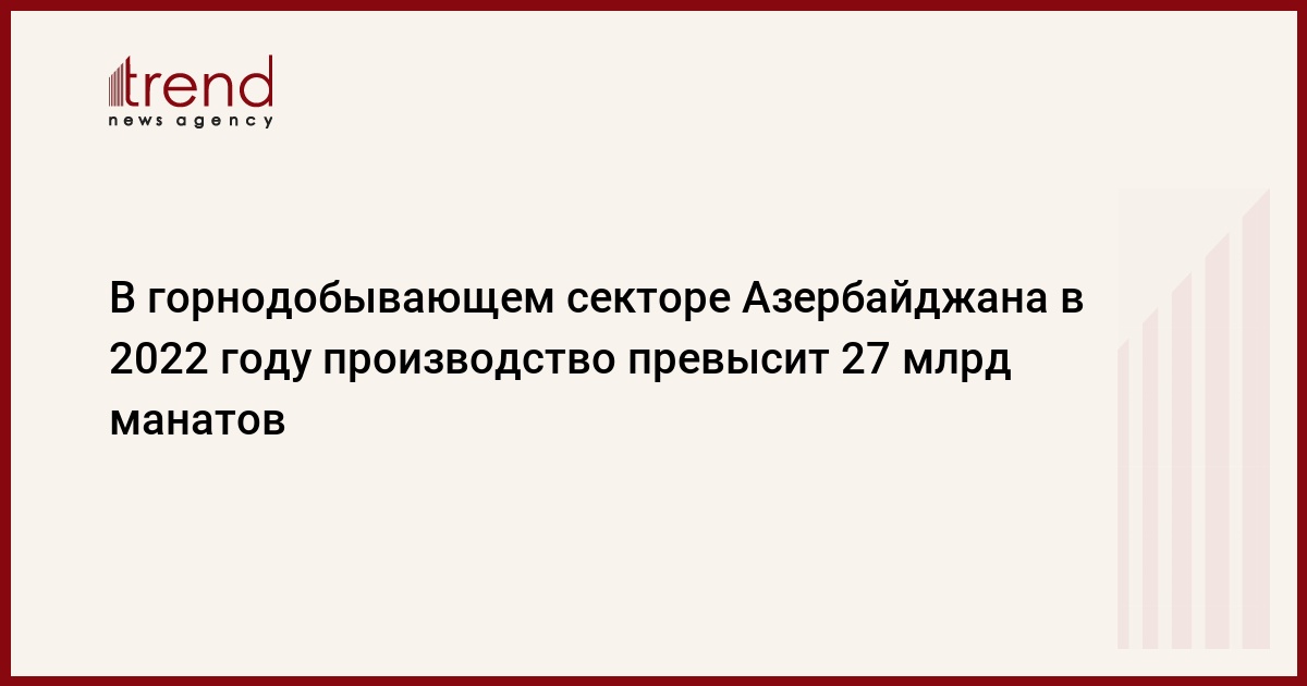 БАКУ / Trend / - Производство в горнодобывающей промышленности Азербайджана в 2022 году превысит 27 миллиардов манатов. Об этом, как сообщает в среду Trend, говорится в проекте государственного бюджета Азербайджана на будущий год.