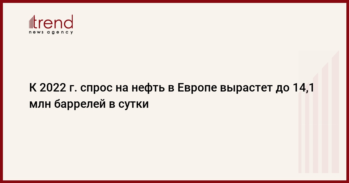 БАКУ /Trend/ - Спрос на нефть в Европе прогнозируется в среднем на уровне 13,7 миллиона баррелей в сутки по итогам2021 года, а в 2022 году этот показатель вырастет до 14,1 миллиона баррелей в сутки, сообщает Trend в среду со ссылкой на американский банк JP Morgan Bank.