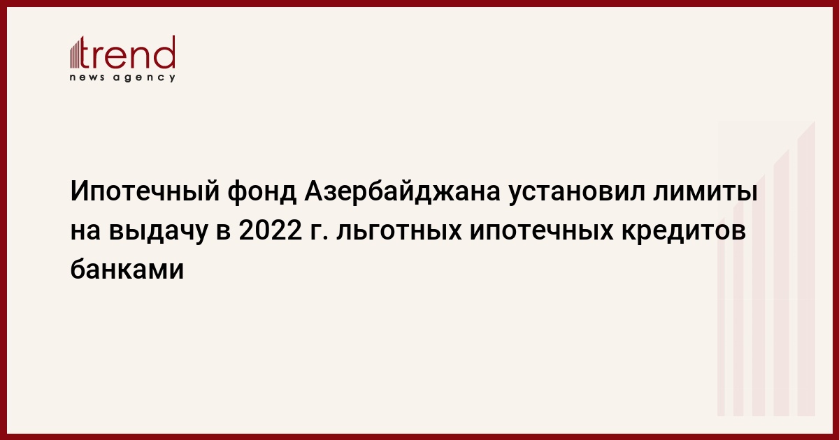 БАКУ /Trend/ - С целью продолжения процесса ипотечного кредитования в 2022 году установлены лимиты на выдачу ипотечных кредитов, в том числе льготных ипотечных кредитов, уполномоченными банками.