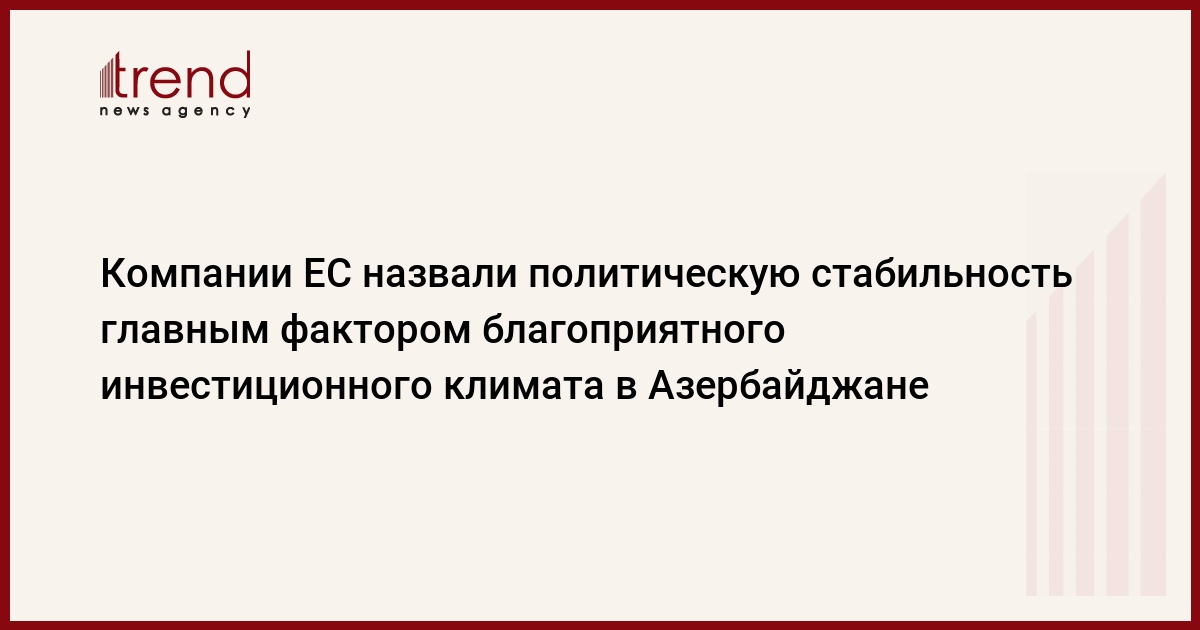 БАКУ /Trend/ - Компании ЕС в Азербайджане назвали политическую и социальную стабильность главным фактором благоприятного инвестиционного климата в стране, сообщает Trend в пятницу со ссылкой на шестое издание Отчета ЕС о деловом климате в Азербайджане.