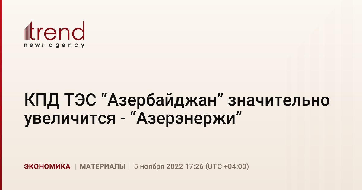 БАКУ /Trend/ - С формированием высокоэффективного генерирующего комплекса на ТЭС “Азербайджан” коэффициент полезного действия (КПД) увеличится на 18 процентов - до 56 процентов.