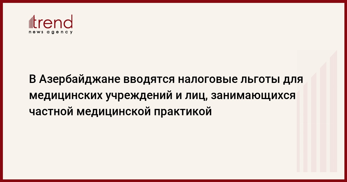 БАКУ /Trend/ - С сегодняшнего дня в Азербайджане налоговые льготы будут предоставлены медицинским учреждениям и физическим лицам, занимающимся частной медицинской практикой.