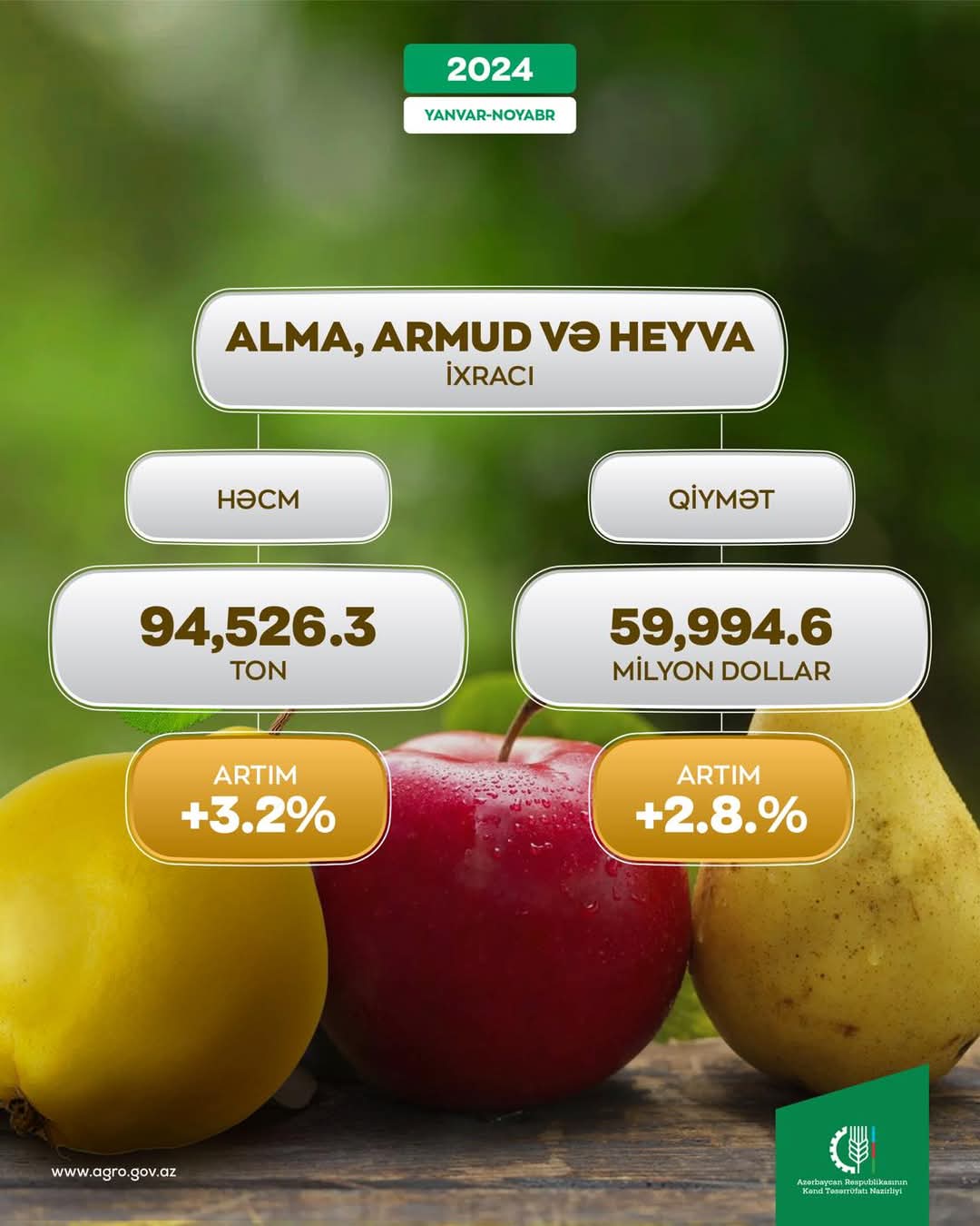 Общая стоимость экспорта яблок, груш и айвы из Азербайджана составила 59 миллионов 994 тысячи 600 долларов. От экспорта этих фруктов было получено на 2.8 процента больше доходов по сравнению с январем-ноябрем прошлого года.