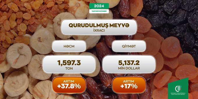 Средства, полученные от экспорта сухофруктов за этот период, составили 5.137.2 тысячи долларов, что на 17 процентов больше по сравнению с январем-ноябрем прошлого года.