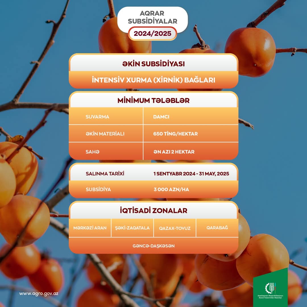 Как сообщили Trend в министерстве сельского хозяйства, согласно решению Совета по аграрным субсидиям, фермерам, создавшим с 1 сентября 2024 года по 31 мая 2025 года сады хурмы в Центрально-Аранской, Шеки-Загатальской, Газах-Товузской и Карабахской экономической зонах, будет предоставлена единовременная субсидия в размере 3000 манатов за каждый гектар.