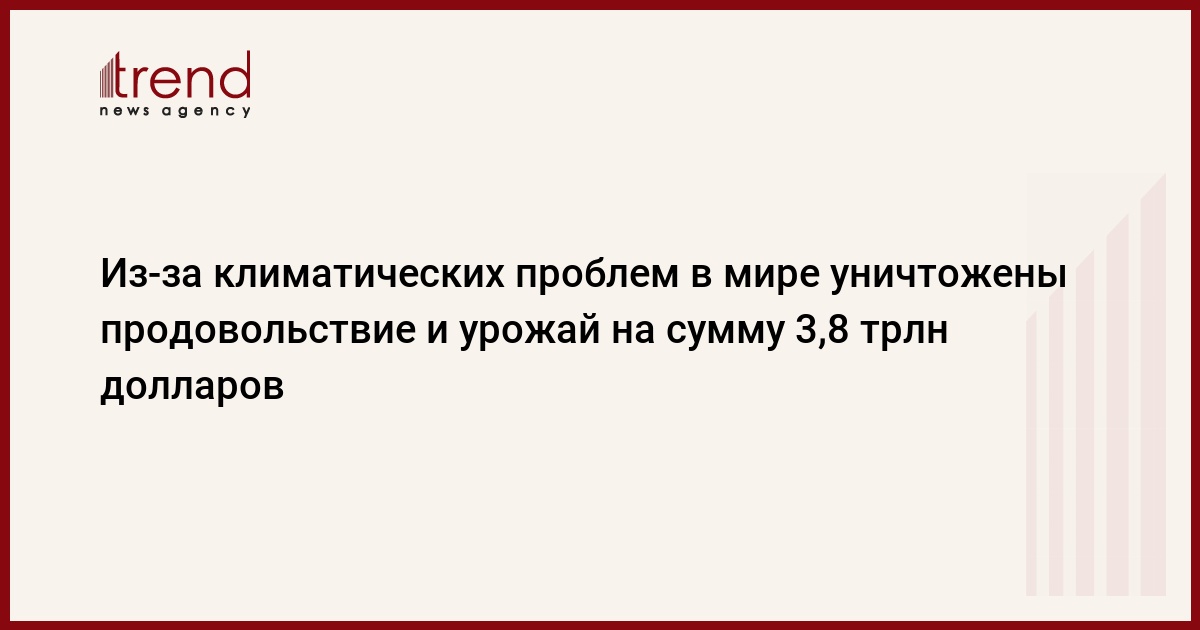 БАКУ /Trend/ - Согласно статистическим данным за последние 30 лет, из-за засух, наводнений и стихийных бедствий были уничтожены продовольствие и урожай на сумму 3,8 триллиона долларов.