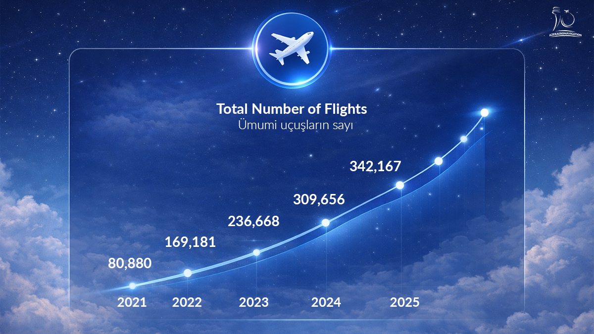 Особое внимание привлекает динамика транзитных перевозок. С 2021 года объём транзитных полётов через воздушное пространство Азербайджана увеличился на 360%. На этом фоне число ежедневных транзитных полётов в районе полётной информации Баку (Baku FIR) в отдельные дни достигало 830, что наглядно свидетельствует о росте операционной интенсивности.