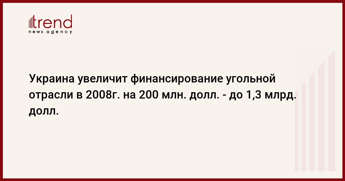 Финансирование угольной отрасли Украины в 2008г. планируется увеличить по сравнению с 2007г. примерно на 200 млн долл., сообщил в Киеве журналистам министр угольной промышленности страны Сергей Тулуб, комментируя одобренный украинским правительством проект госбюджета на 2008г. Общий бюджет отрасли достигнет 1,3 млрд долл., передает РБК .