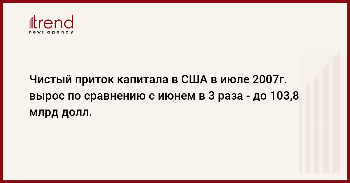 Чистый приток капитала в США в июле 2007г. вырос до 103,8 млрд долл., превысив, таким образом, июньский показатель, зафиксированный, по окончательным данным, на уровне 34,4 млрд долл., в 3 раза. Такие данные содержатся в материалах, опубликованных сегодня Министерством финансов США. Ранее сообщалось, что в июне с.г., по предварительным данным, чистый приток капитала в США составлял 58,8 млрд долл, передает РБК .За указанный период объем продаж иностранцами долгосрочных американских ценных бумаг составил 3 млрд долл. (в июне с.г. объем приобретений составлял 81,8 млрд долл.). Покупка иностранцами американских краткосрочных ценных бумаг и других денежных обязательств составила 66,6 млрд долл. (месяцем ранее была зафиксирована продажа - на 27,6 млрд долл.), а приток капитала, образовавшийся от разницы принадлежащих американским и иностранным банкам денежных обязательств, составил по итогам июля с.г. 40,3 млрд долл. (месяцем ранее был зафиксирован отток на уровне 19,8 млрд долл.).
