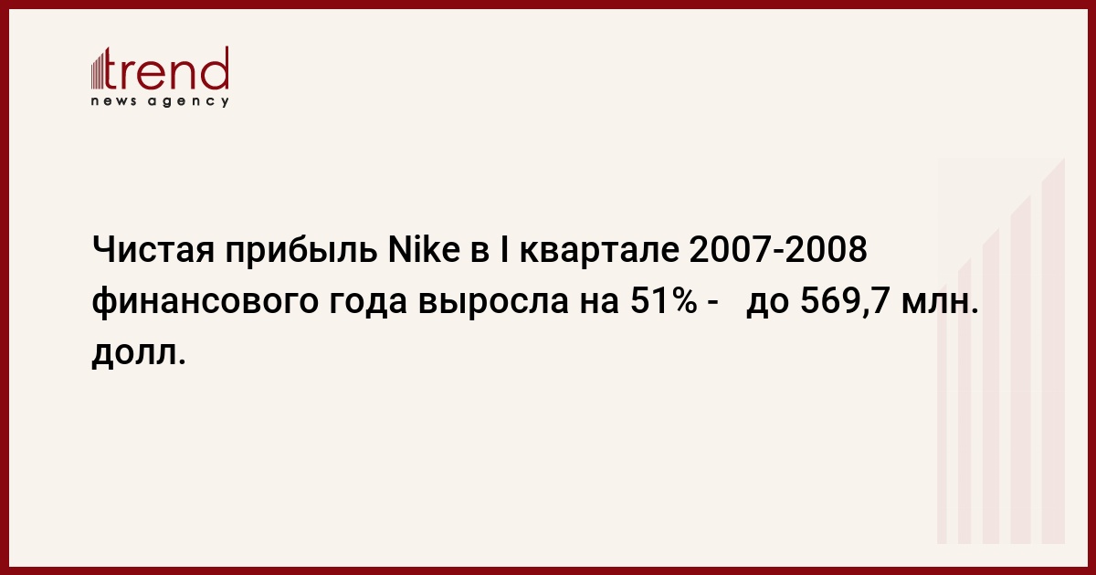 Чистая прибыль крупнейшего мирового производителя спортивной обуви и одежды Nike Inc. в I квартале 2007-2008 финансового года, завершившемся 31 августа с.г. составила 569,7 млн долл. Это на 51% больше показателя в 377,2 млн долл., полученными за аналогичный период годом ранее. Такая информация содержится в распространенном пресс-релизе компании. Объем продаж увеличился на 11% - до 4,7 млрд долл. по сравнению с 4,19 млрд долл. годом ранее, передает РБК .