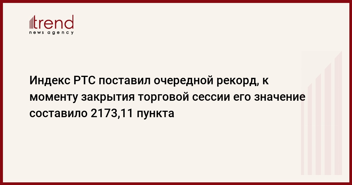 Индекс РТС поставил очередной рекорд, к моменту закрытия торговой сессии его значение составило 2173,11 пункта, сообщили в пресс-центре биржи. Максимальное внутридневное значение индекса зафиксировано на уровне 2174,45.Предыдущий рекорд индекса РТС был зафиксирован накануне, когда основной индикатор фондового рынка достиг значения 2143,69 пункта. Максимальное внутридневное значение зафиксировано на уровне 2159,59 пункта, передает РБК .Фьючерс на индекс РТС с исполнением в декабре 2007г. закрылся сегодня на уровне 2191,50 пункта, что выше текущего значения индекса РТС на 18,39 пункта. Это свидетельствует о том, что профессиональные участники рынка России настроены оптимистично, и полагают, что в середине декабря 2007г. российский фондовый рынок превысит 2190 пунктов по индексу РТС, отмечаетсяв сообщении биржи.Индекс РТС - основной индикатор российского фондового рынка. Индекс рассчитывается на основании котировок 50 наиболее ликвидных акций самых капитализированных российских компаний.