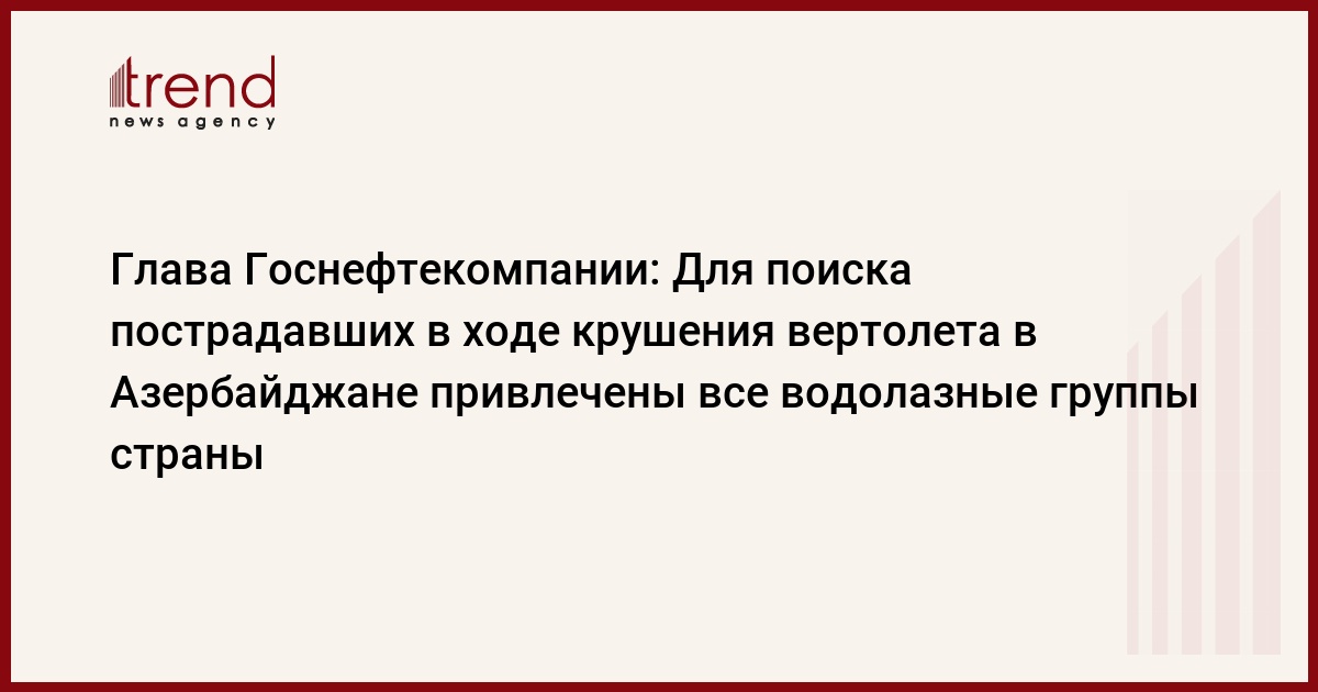 Азербайджан, Баку /корр. Trend С.Алиев/ Для поиска тел пострадавших в ходе крушения в море вертолета Ми-8т, государственного концерна AZAL привлечены все водолазные группы республики, сказал в субботу президент Государственной нефтяной компании Азербайджана Ровнаг Абдуллаев. По его словам, в распоряжение этих групп предоставлено самое современное водолазно-спасательное оборудование, находящееся в распоряжении Госнефтекомпании. Это оборудование позволяет проводить съемку под водой и передавать все полученные данные на суда.