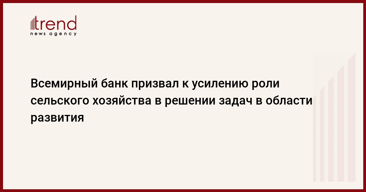 Всемирный банк распространил доклад "Сельское хозяйство на службе развития", в котором призвал существенно расширить инвестиции в сельское хозяйство развивающихся стран и уделить главное внимание этому сектору при решении задач развития для сокращения нищеты и голода. ( РБК )