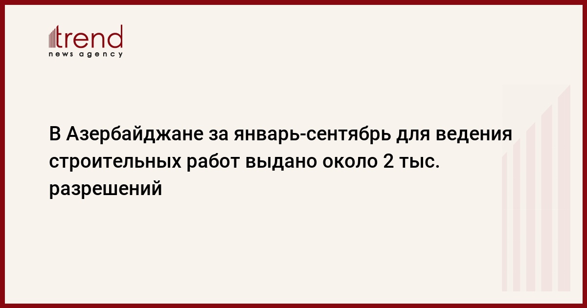 Азербайджан, Баку /корр. Trend У.Исмайлова/ За январь-сентябрь в Азербайджане выдано 1946 государственных разрешений на строительство производственных и непроизводственных объектов и зданий на сумму 258,1 миллионов манатов, говорится в сообщении Государственного комитета по статистике.