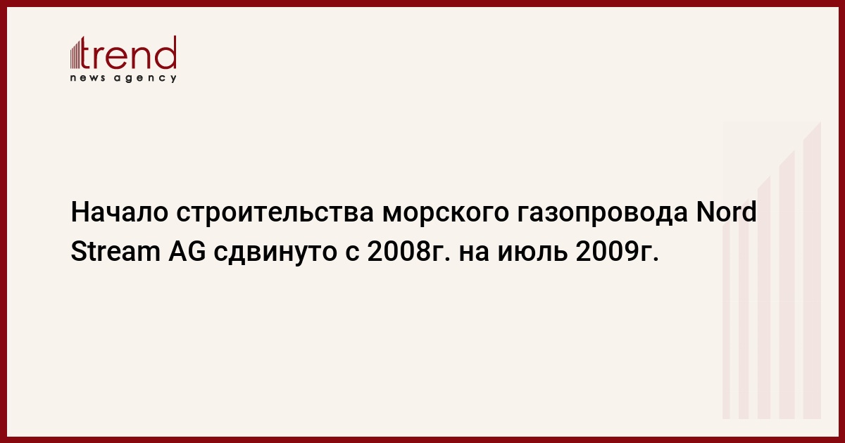 Начало строительства морского газопровода Nord Stream AG сдвинуто с 2008г. на июль 2009г., передает РБК . Об этом сегодня на пресс-конференции сообщил управляющий директор Nord Stream AG Маттиас Варниг. По его словам, прокладка трубы начнется в июле 2009г., завершить строительство планируется в 2010г. Технический директор Nord Stream Сергей Сердюков также не исключил того, что могут быть сдвинуты сроки завершения проекта в целом.