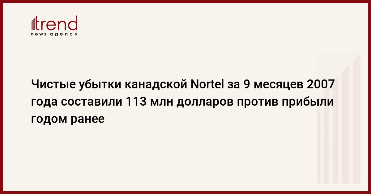 Чистые убытки крупнейшего в Северной Америке производителя телекоммуникационного оборудования канадской корпорации Nortel Networks Corp. за 9 месяцев 2007г. составили 113 млн долл. против прибыли в 108 млн долл. годом ранее. При этом выручка составила 7,75 млрд долл., что на 4,3% ниже показателя за январь-сентябрь 2006г. в 8,1 млрд долл. Операционныеубытки зафиксированы на уровне 25 млн долл. в сравнении с прибылью в 240 млн долл. за 9 месяцев минувшего года. Такие данные содержатся в отчете компании. ( РБК )