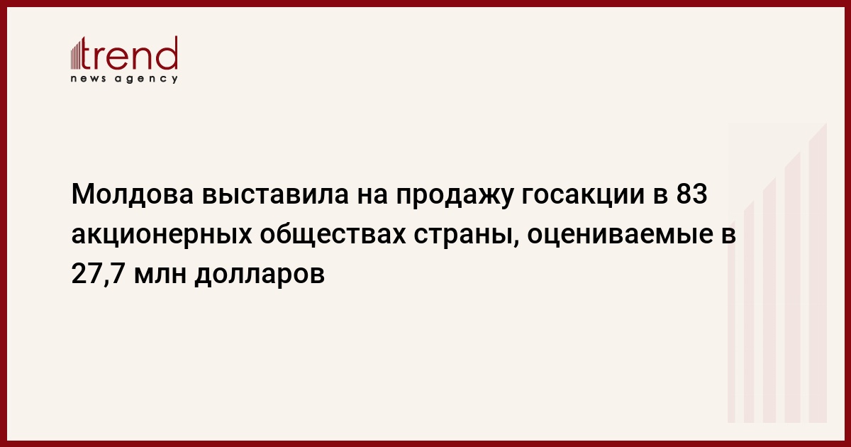 Молдова выставила на продажу акции государства в 83 акционерных обществах страны, в том числе в шести табачно-ферментационных фабриках, предприятиях консервной и молочной отраслей. Как сообщил на пресс-конференции в Кишиневе министр экономики и торговли Игорь Додон, общая стоимость выставленных на продажу пакетов акций с учетом предложенной цены ихреализации составляет 316,9 млн леев (27,7 млн долл.), а их общая номинальная стоимость равна 241,1 млн леев (21,1 млн долл.) ( РБК )
