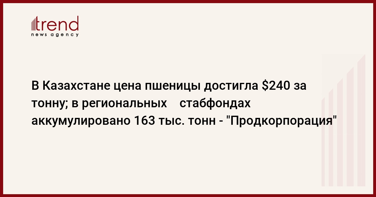 "В текущем году цены в основных странах-экспортерах зерна резко возросли из-за снижения мировых запасов до 107 млн тонн. В итоге на мировых биржах цены повысились до 350 долларах США за тонну пшеницы. В Казахстане цена выросла до 240 долларов США", - сообщается в пресс-релизе "Продкорпорации", распространенном на пресс-конференции в Астане.