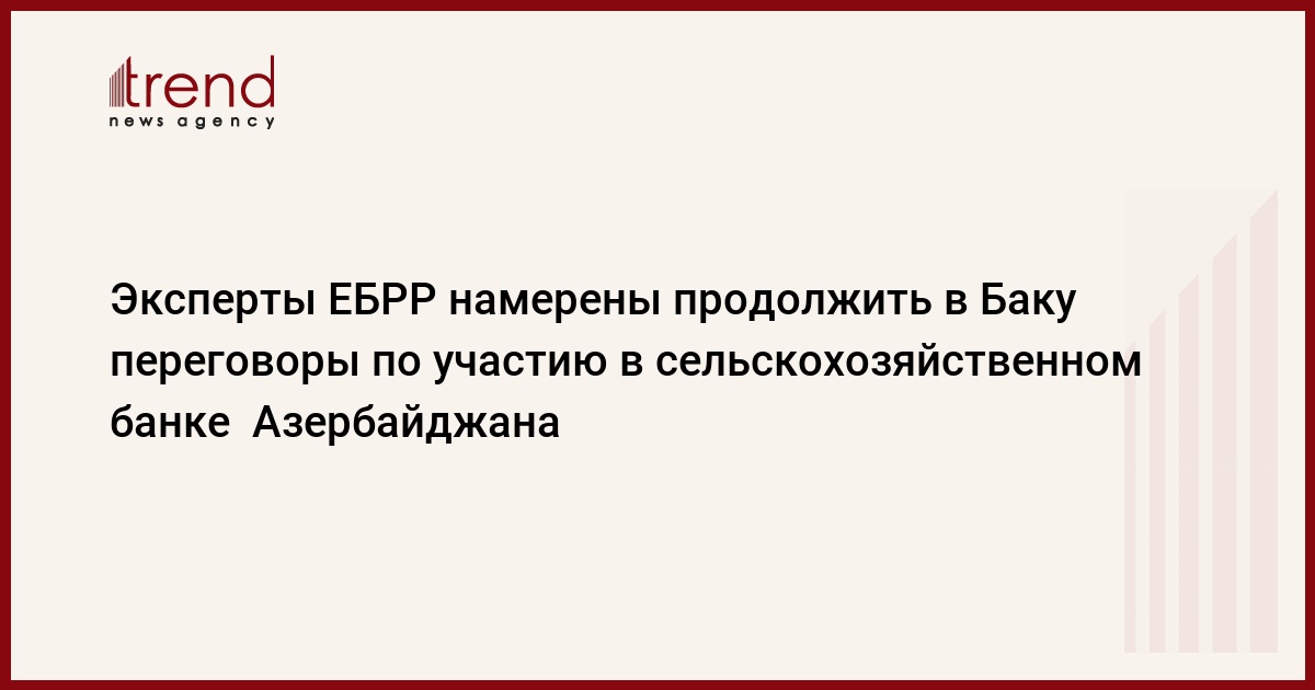 Азербайджан, Баку, 4 февраля /корр. Trend И.Халилова / Европейский банк реконструкции и развития (ЕБРР) продолжит оценку небанковской кредитной организации "Аграр-кредит" в связи с планами вхождения в ее акционеры и визит миссии банка в Азербайджан ожидается в начале марта, сказали в понедельник в "Аграр-кредит". Первая оценка состоялась в ноябре прошлого года