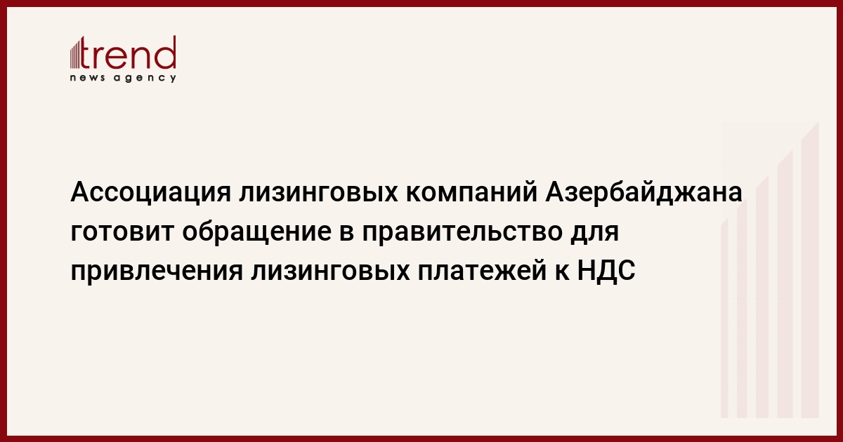 Азербайджан, Баку, 4 февраля /корр. Trend У.Исмайлова/ Ассоциация лизинговых компаний Азербайджана (ALCA) готовит обращение в министерство финансов, министерство по налогам и Кабинет министров для привлечения лизинговых платежей к НДС, сказал в понедельник председатель правления ассоциации Азер Мамедов.