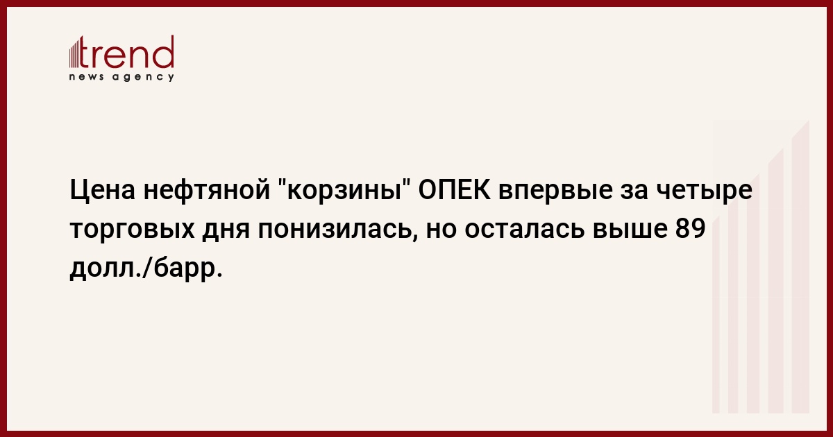 Цена нефтяной "корзины" ОПЕК впервые за четыре торговых дня понизилась, но осталась выше 89 долл./барр. По состоянию на 13 января ее цена составила 89,65 (-0,16) долл./барр., сообщает РБК .