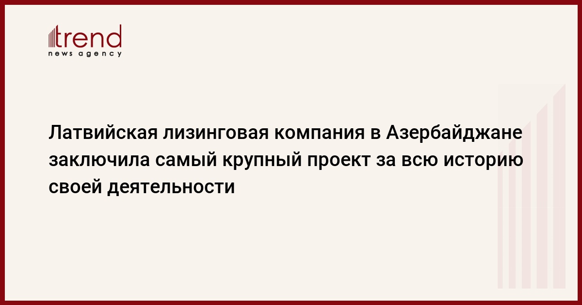 Азербайджан, Баку, 20 февраля /корр. Trend У.Исмайлова/ Латвийская лизинговая компания Parex Leasing and Factoring в конце 2007 года начала реализацию самого крупного в своей истории проекта, стоимостью свыше $5 млн., сообщили во вторник в компании.