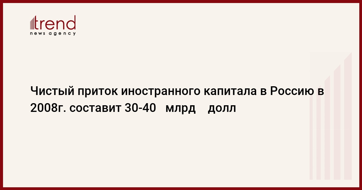 Чистый приток иностранного капитала в Россию в 2008г. составит 30-40 млрд долл , передает РБК.