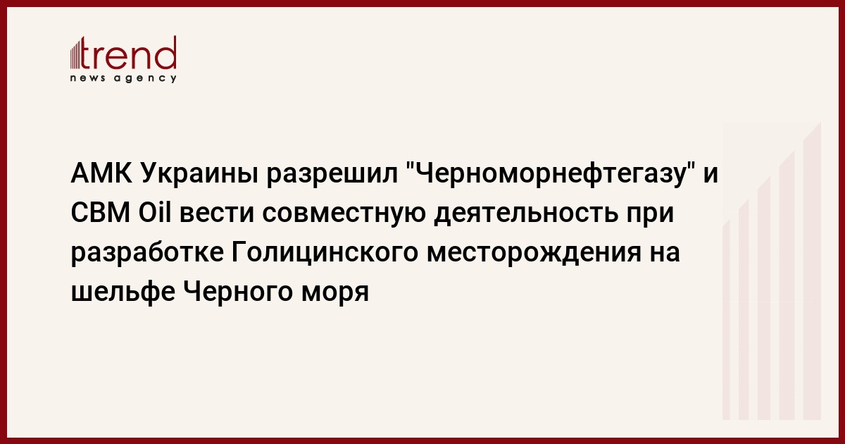 Украина, Киев, 28 марта /корр. Trend З.Новосвитский/ Антимонопольный комитет Украины (АМК) предоставил разрешение ГАО "Черноморнефтегаз" (г. Симферополь, АР Крым) и компании CBM Oil plc. (Англия) на согласованные действия в виде осуществления совместной деятельности субъектами ведения хозяйства, без создания юридического лица, на основании договора о совместной деятельности. Об этом сообщает пресс-служба АМК.