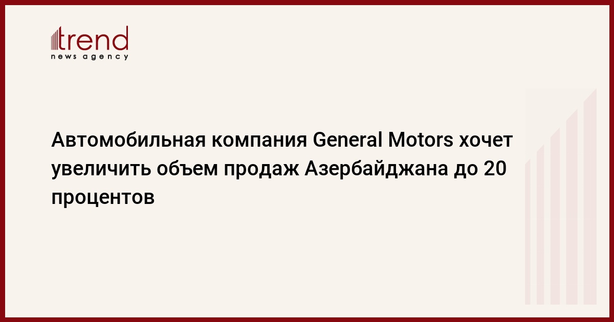 Азербайджан, Баку, 30 мая /корр. Trend Э.Исмайлов/ Автомобильная компания General Motors хотела бы увеличить объем продаж на автомобильном рынке Азербайджана до 15-20 процентов от общего объема рынка, сказал исполнительный директор по продажам, маркетингу и постмаркетингу компании General Motors в Центральной и Восточной Европе Крис Ласей. Компания хотела бы заключить больше контрактов в Азербайджане и расширить дилерскую сеть. "Азербайджан - очень важная и быстроразвивающаяся страна", - сказал Ласей.