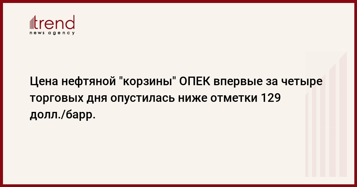Цена нефтяной "корзины" ОПЕК впервые за четыре торговых дня опустилась ниже отметки 129 долл./барр., передает РБК. По состоянию на 17 июня цена "корзины" составила 128,98 долл./барр. "Корзина" подешевела на 80 центов, а ее цена опустилась до своего самого низкого значения после 11 июня с.г. Напомним, что историческим максимумом для "корзины" ОПЕК является ценовая отметка 130,87 долл./барр., зарегистрированная 9 июня 2008г.