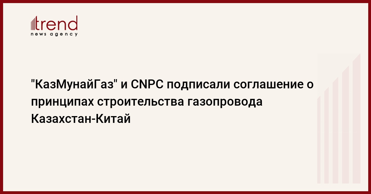 НК "КазМунайГаз" (Казахстан) и Китайская национальная нефтегазовая корпорация (CNPC) подписали соглашение об основных принципах строительства и эксплуатации газопровода Казахстан-Китай, передает РБК. Как сообщает пресс-служба "КазМунайГаза", соглашение подписано в Астане 30 июля 2008г. Оно закрепляет принципы финансирования проекта, регулирует вопросы тарифообразования, гарантированных объемов газа (ship-or-pay) и рентабельности проекта.