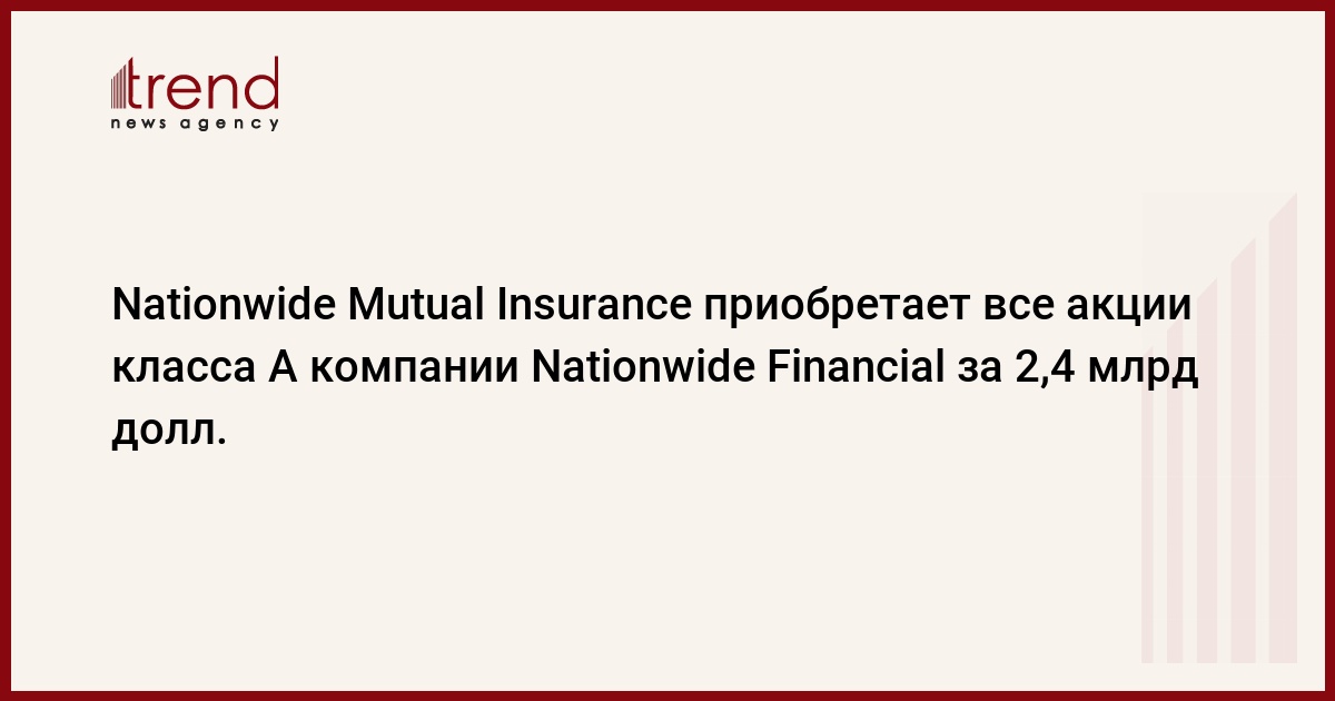 Финансовая компания Nationwide Financial Services Inc. сообщила сегодня о том, что материнская компания Nationwide Mutual Insurance Co. Приобретает все ее акции класса А. Об этом говорится в опубликованном сегодня пресс-релизе компании. Nationwide Mutual Insurance согласилась выплатить 52,25 долл. за каждую акцию класса А Nationwide Financial, что на 11% вышепредложенных 47,2 долл. за акцию материнской компанией ранее. Таким образом, общая сумма сделки составляет приблизительно 2,4 млрд долл. Как сообщается в пресс-релизе, сделку планируется завершить в либо конце 2008г., либо в начале 2009г., когда будет получено одобрение со стороны акционеров и регуляторов.