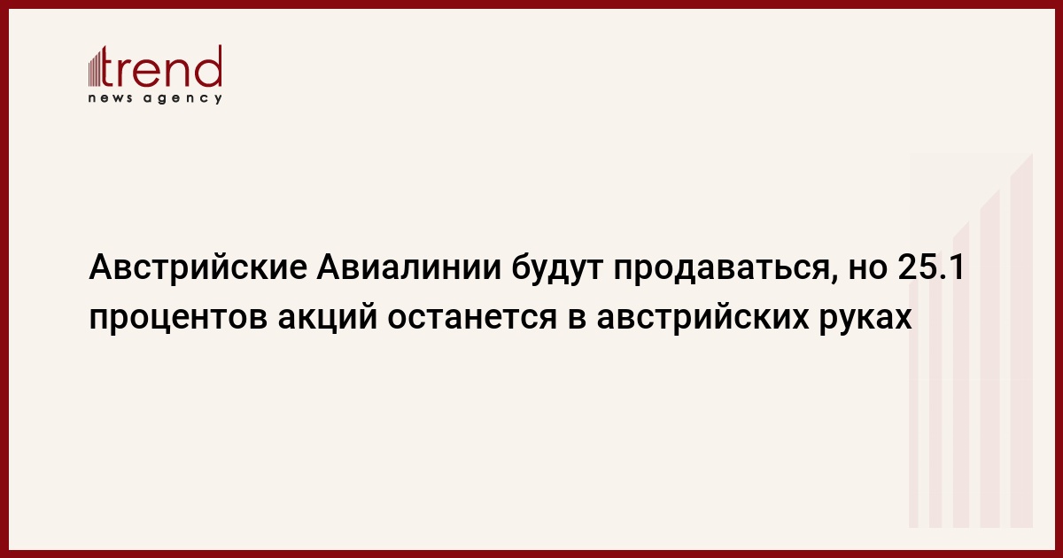 Австрия, Вена, 7 августа /корр. Trend А.Алескеров/ Австрийское правительство даст разрешение на приватизацию Austrian Airlines, однако, 25.1 процентов акций должны быть в австрийских руках. Этим меньшинством может быть не только государство, но также частные инвесторы.