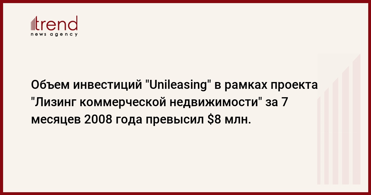 Азербайджан, Баку, 11 августа / Trend / Лизинговая компания "Unileasing" по состоянию на первое августа 2008 года инвестировала в развитие рынка недвижимости в республике более $8 млн., говорится в сообщении компании, распространенном в понедельник.