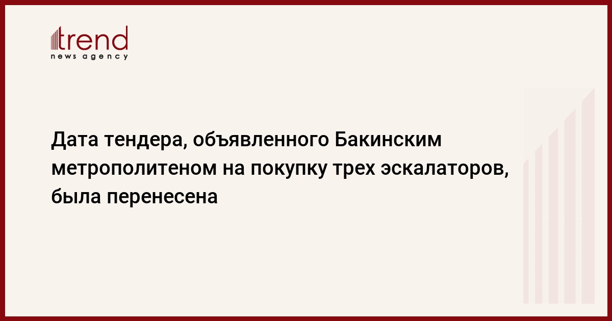 Азербайджан, Баку, 12 августа / Trend / Дата вскрытия тендерных предложений на демонтаж трех эскалаторов типа LP, а также покупку, установку, пуско-наладку трех туннельных эскалаторов для станции метро "Ичери Шехер" из-за внесения изменений в проект была перенесена с 1 на 16 сентября.