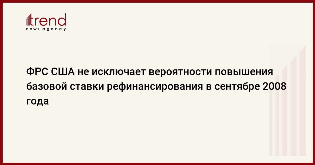 Федеральная резервная система (ФРС) США, исполняющая в стране функции центрального банка, не исключает вероятности повышения ставки федеральных фондов (базовой ставки рефинансирования) на своем следующем заседании 16 сентября 2008г, передает РБК .