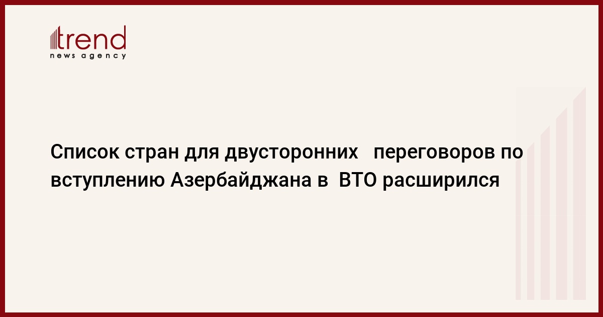 Азербайджан в апреле провел переговоры с Норвегией, Шри-Ланка, Индией, Южной Кореей, а в мае - с США, Эквадором, Японией и Китайской провинцией Тайвань. Новые страны - Норвегия, Шри-Ланка, Индия, с которыми Азербайджан только приступил к переговорам также предлагают снизить баум-тарифы, предложенные правительством в последний раз.