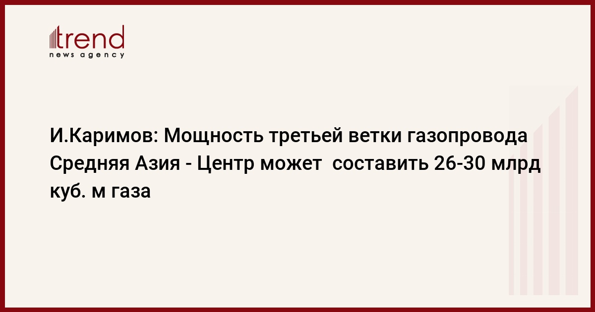 Предполагаемая мощность дополнительной ветки газопровода Средняя Азия - Центр составит 26-30 млрд куб. м газа, сообщил сегодня журналистам президент Узбекистана Ислам Каримов по итогам переговоров с премьер-министром РФ Владимиром Путиным, передает РБК.