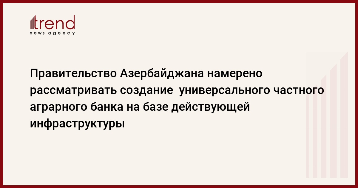Создание универсального частного аграрного банка для предоставления комплексных финансовых услуг сельским хозяйствам и агропромышленным предприятиям было предусмотрено "Государственной программой надежного обеспечения населения Азербайджана продовольственными продуктами в 2008-2015 годах". Причем сроки реализации этих планов заложены на 2009-2010 годы.