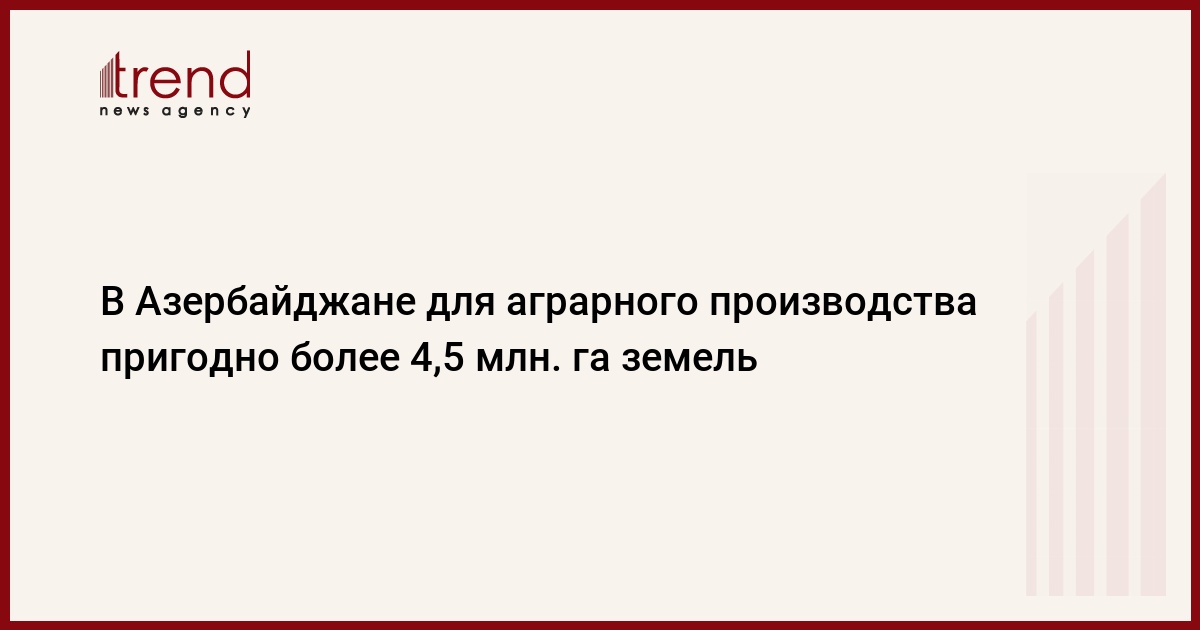 Азербайджан, Баку, 8 сентября /корр. Trend С.Бабаева/ "Сегодня в Азербайджане для сельскохозяйственного производства пригодны 4,6 млн. га земельных участков", - сообщил в понедельник председатель Государственного комитета по земле и картографии Гариб Мамедов. Из этой площади 1,6 млн. га приходится на долю оросительных земель.
